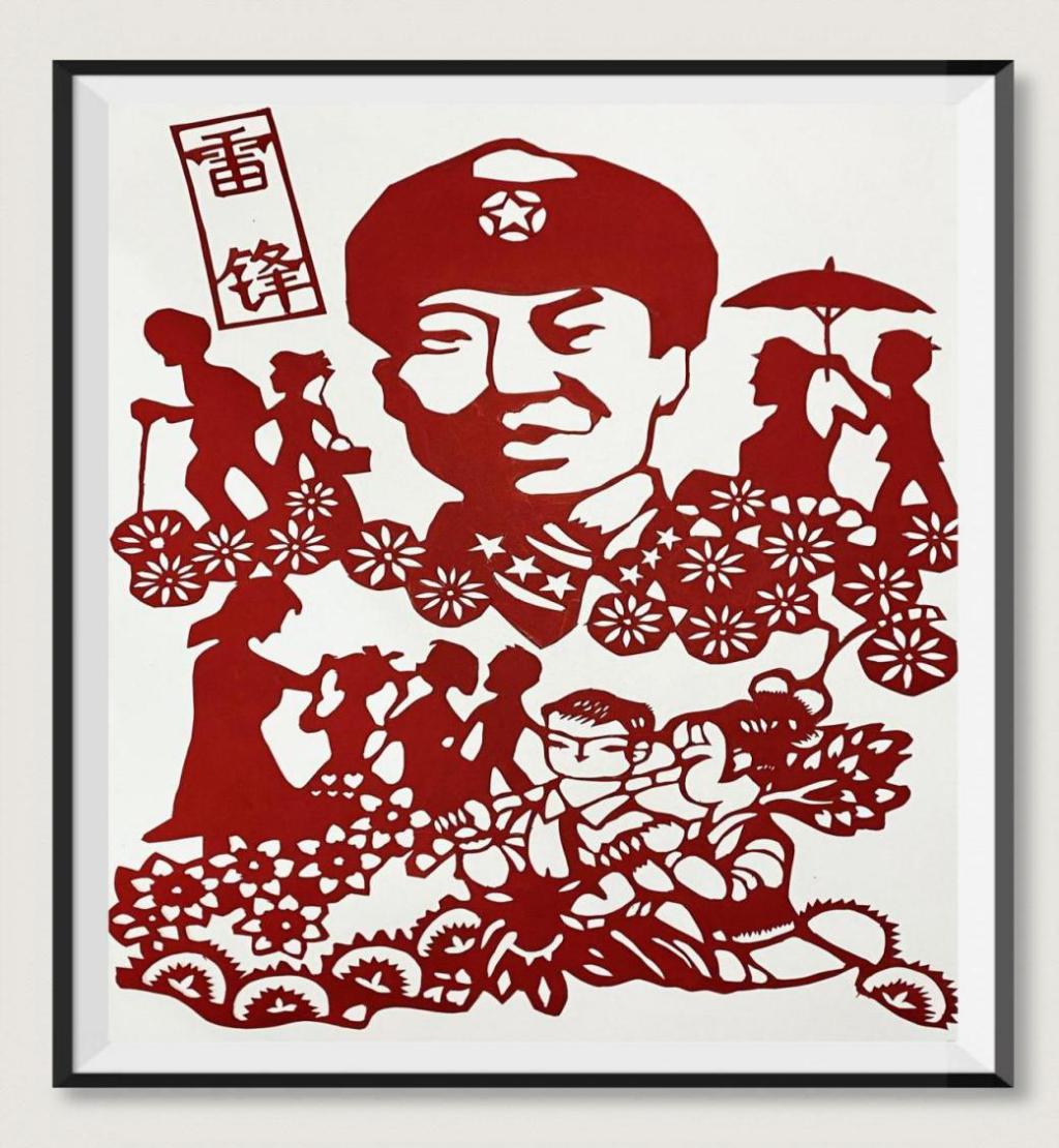 《奉獻(xiàn)》是以雷鋒精神來創(chuàng)作的作品,此次創(chuàng)作以紅色調(diào)來呈現(xiàn),運(yùn)用了中國傳統(tǒng)手工藝法剪紙來完成。