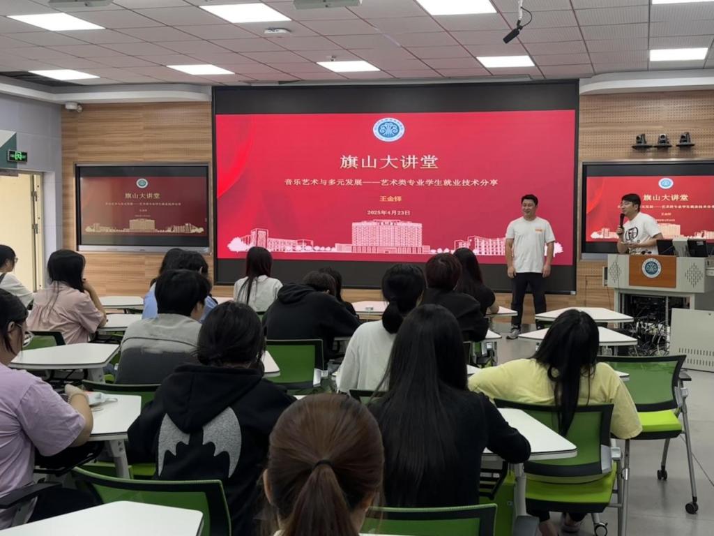 2025年4月23日,藝術(shù)學院舉辦旗山大講堂主題講座活動,本次講座很榮幸的邀請到了著名音樂人、主持人、影視演員王金鐸擔任主講嘉賓。王老師以“音樂藝術(shù)與多元發(fā)展——藝術(shù)類專業(yè)學生就業(yè)技術(shù)分享”為主題結(jié)合自身豐富的藝術(shù)從業(yè)經(jīng)驗,從音樂藝術(shù)之路、多元發(fā)展路徑到實用技能提升,為現(xiàn)場學子帶來了一場兼具啟發(fā)性和實操性的職業(yè)發(fā)展講座。講座由藝術(shù)學院團委書記周宇航主持。